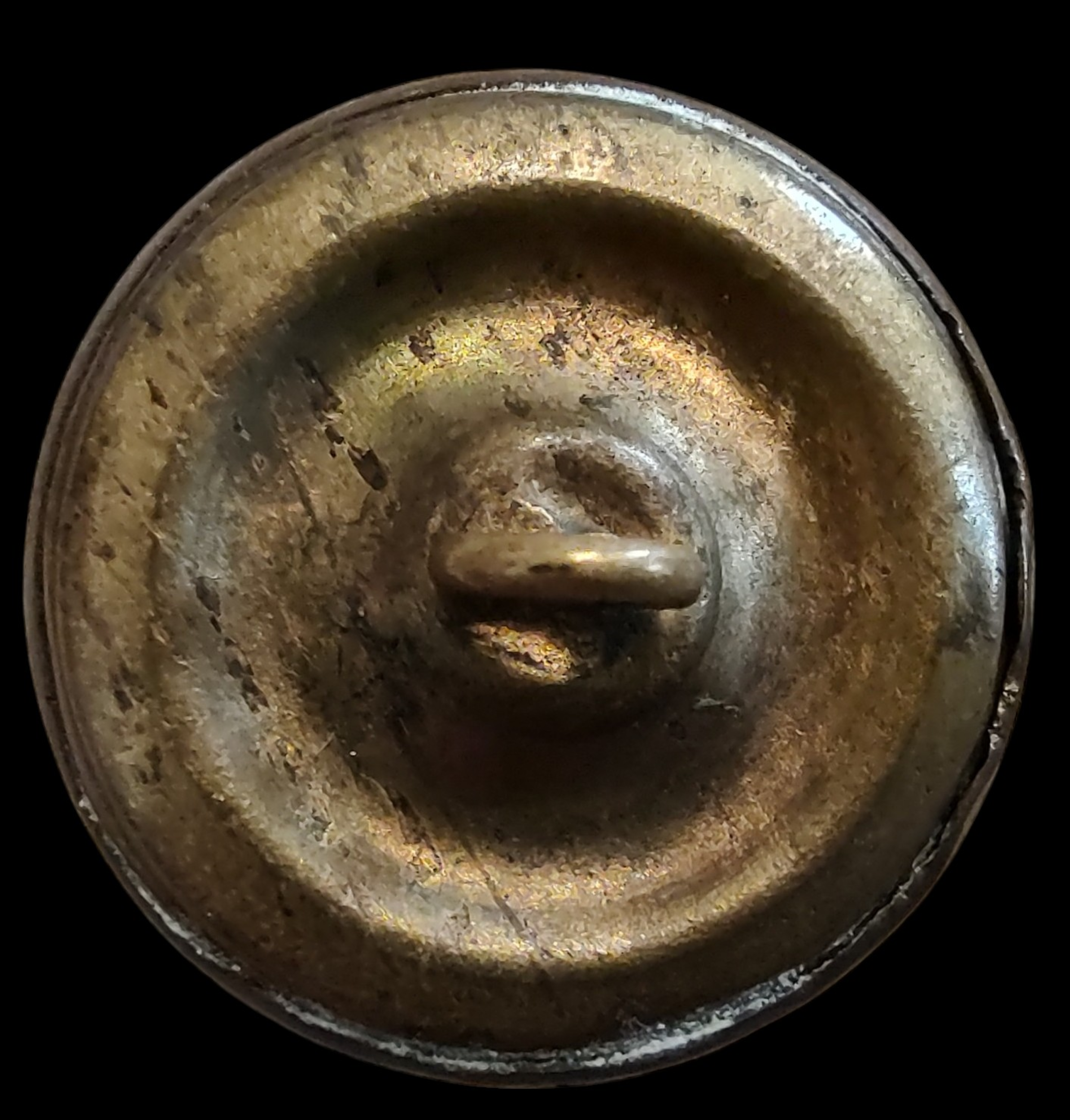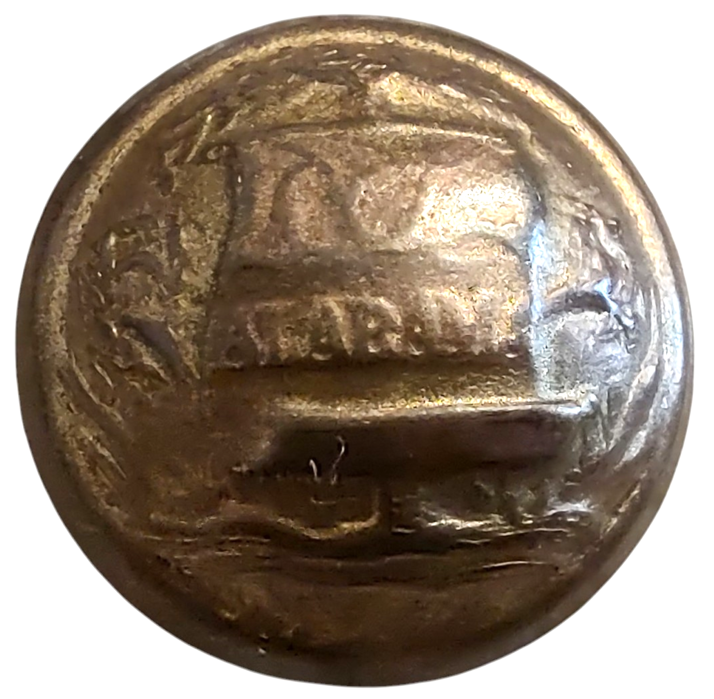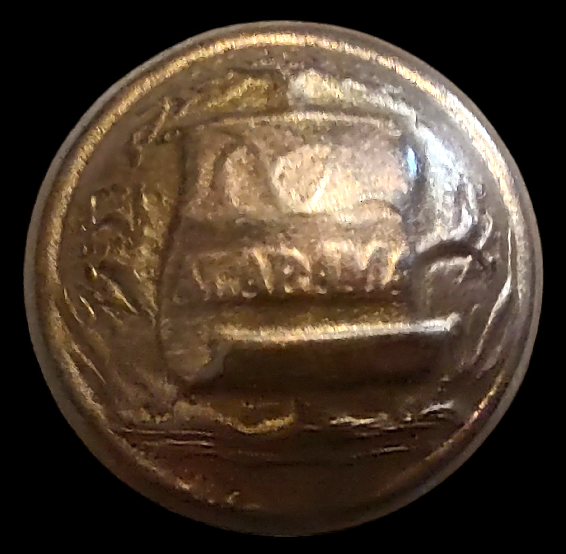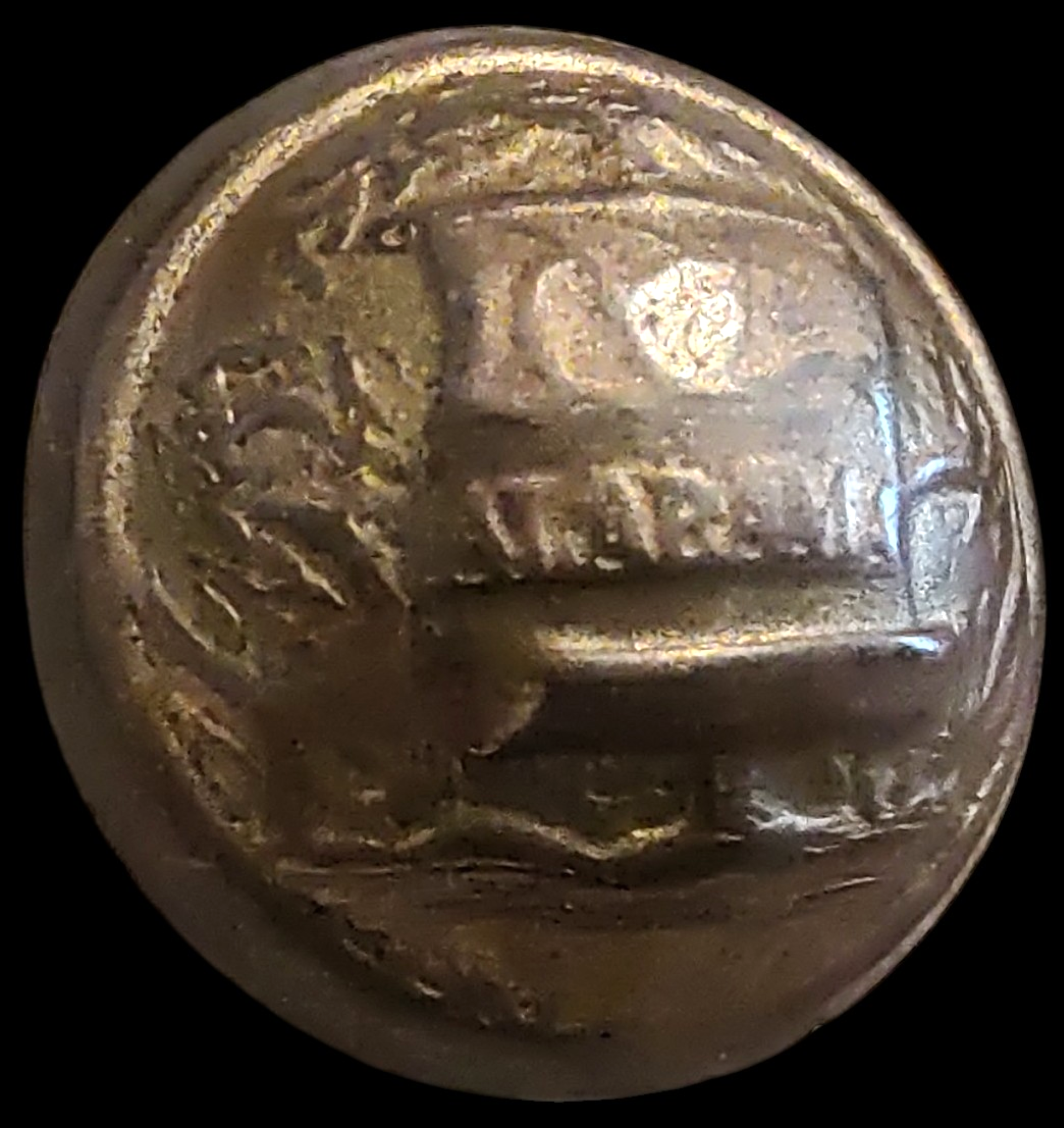 Confederate Local Manufactures. Identification by Tice AB202-A-1, Albert AB7A. Alabama Militia, general use, convex, two-piece. A. The device shows a state seal with “ALABAMA” inscribed at bottom of a map. 22 mm. 1. Blank with a depressed channel. Collectors have generally regarded all Confederate local Alabama state seals as desirable. Non-dug examples are notably more difficult to locate than their excavated counterparts. Very Rare.