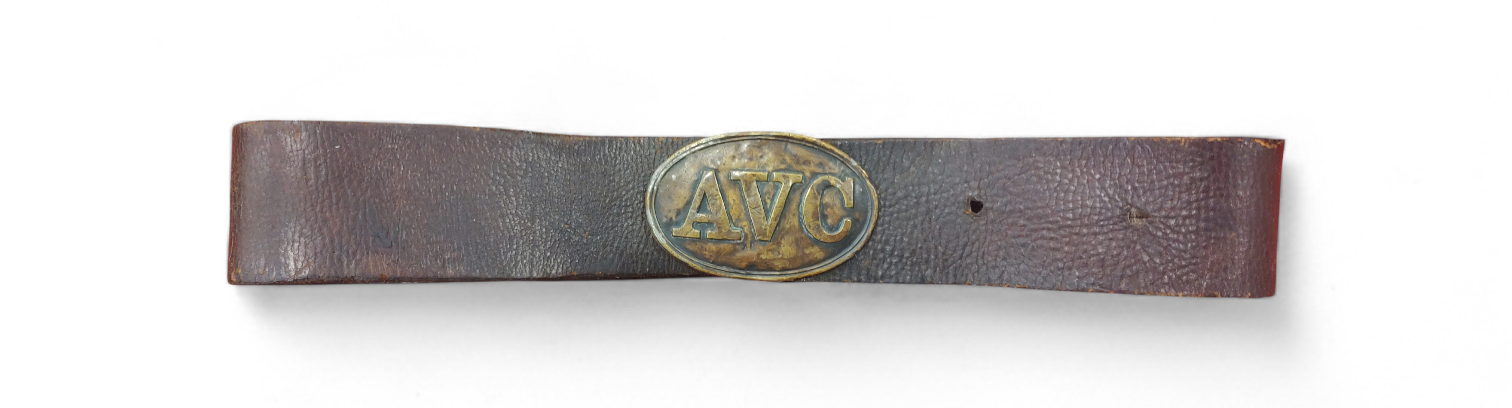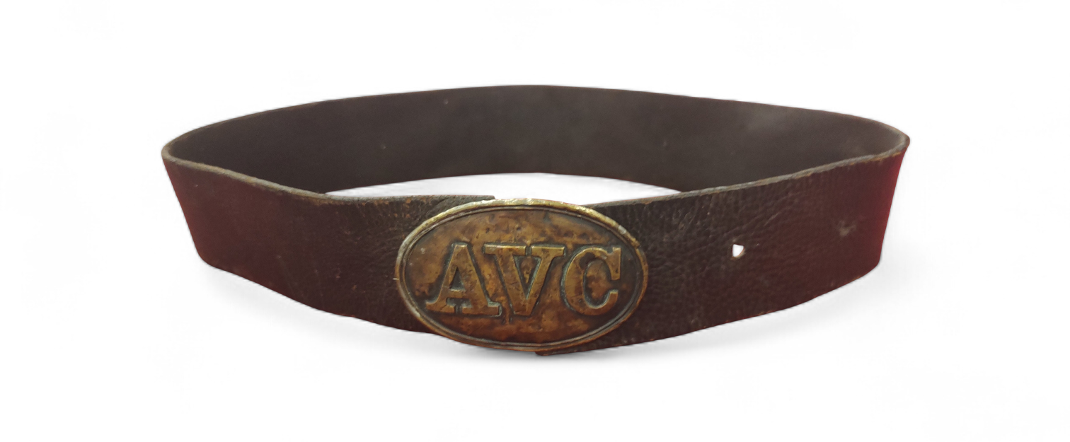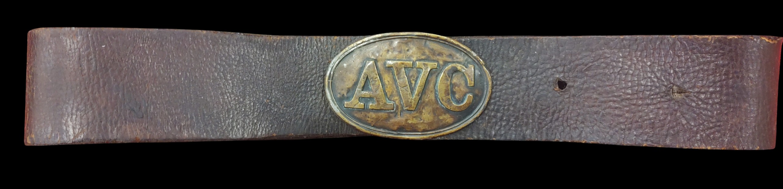 Alabama roughly contributed 120,000 Confederate troops, forming units often composed of local men of Alabama. Featured is a very scarce non-excavated AVC buckle, surviving in an excellent state of original preservation, on authentic Confederate leather belt. This rare confederate plate shows the character of a Confederate plate, that has experienced campaign. Belt has been repurposed from a confederate cartridge box “over the shoulder strap” as is indicative, from “breast plate” slit area on belt. Exceptional condition.