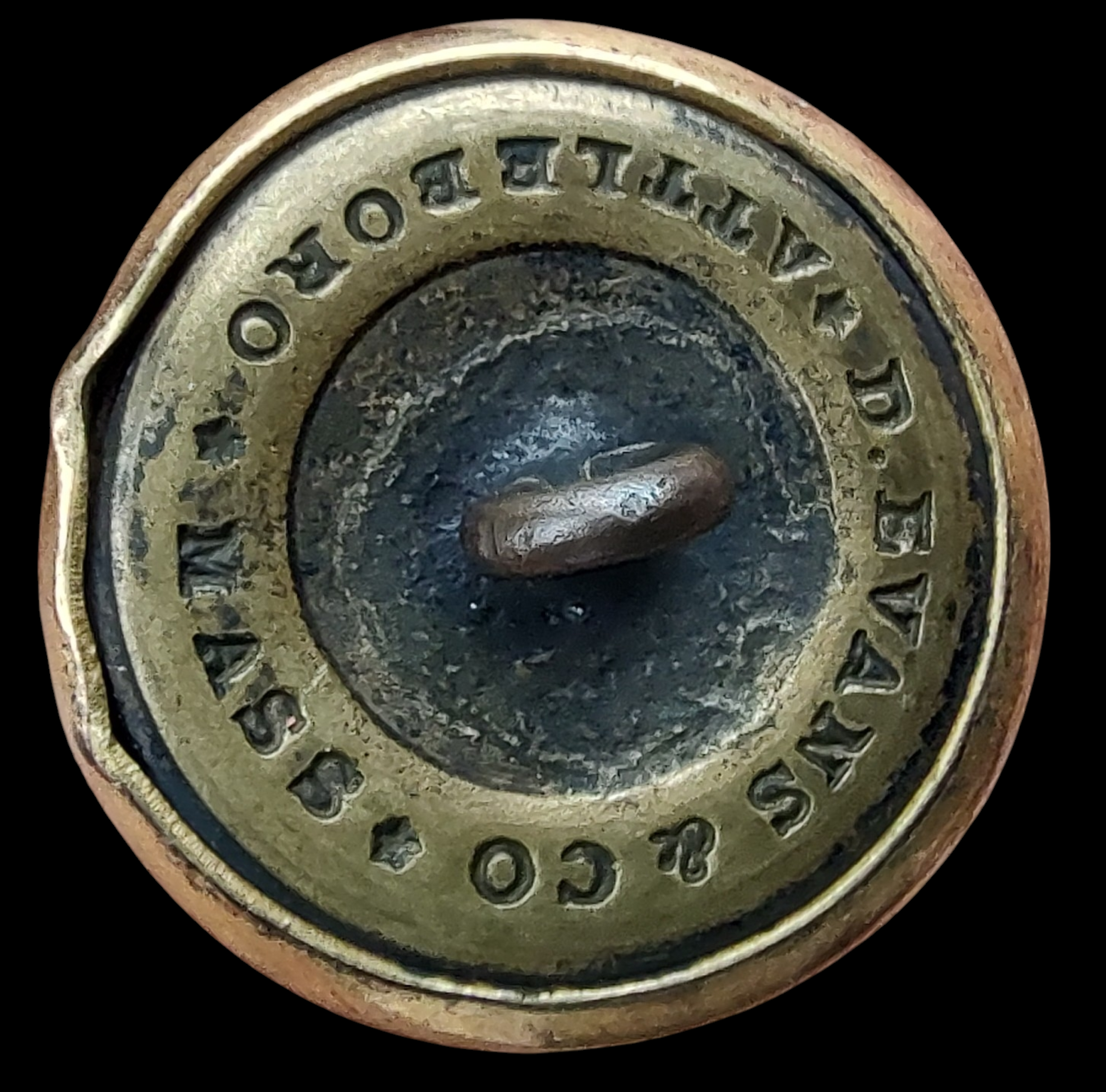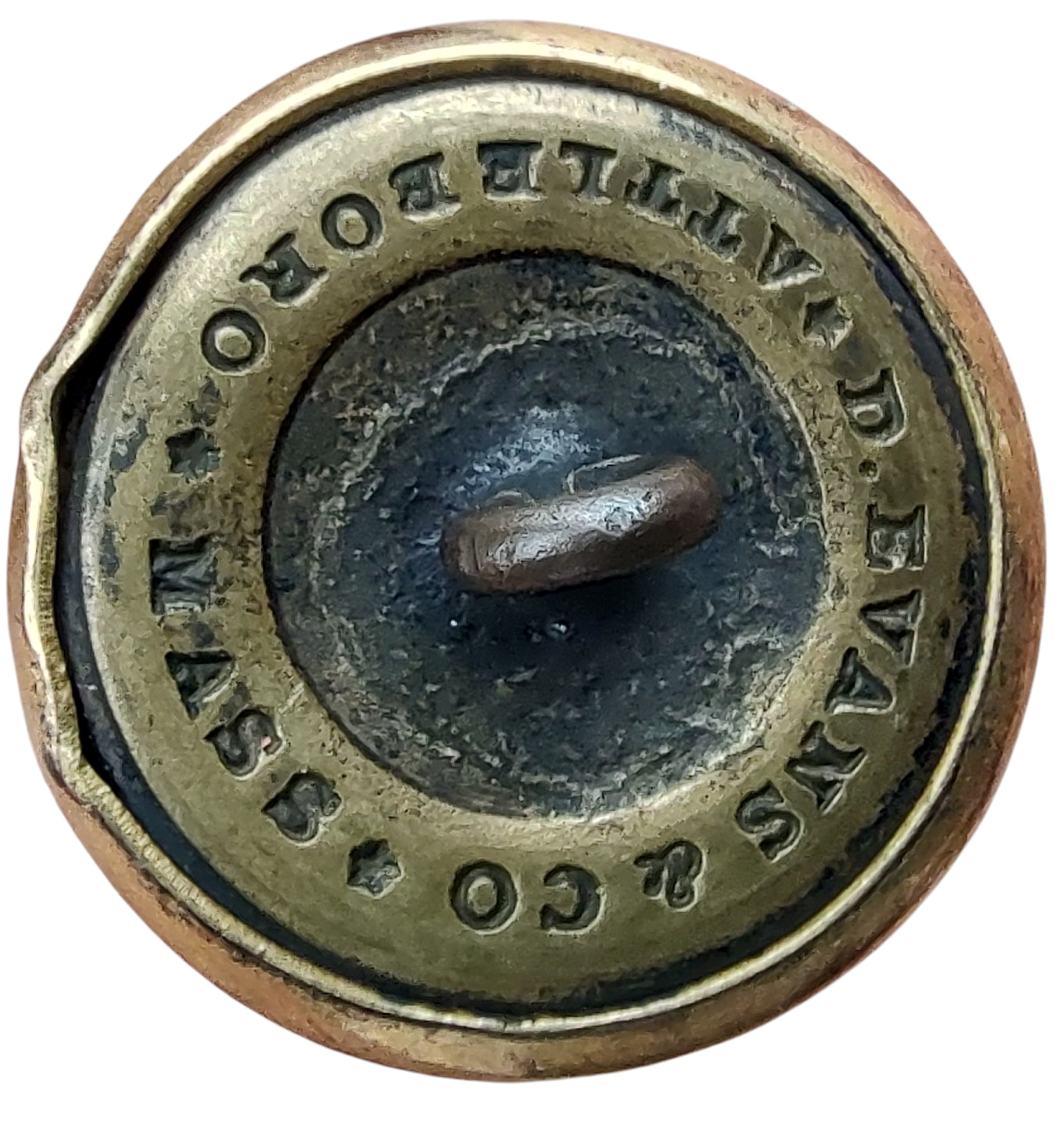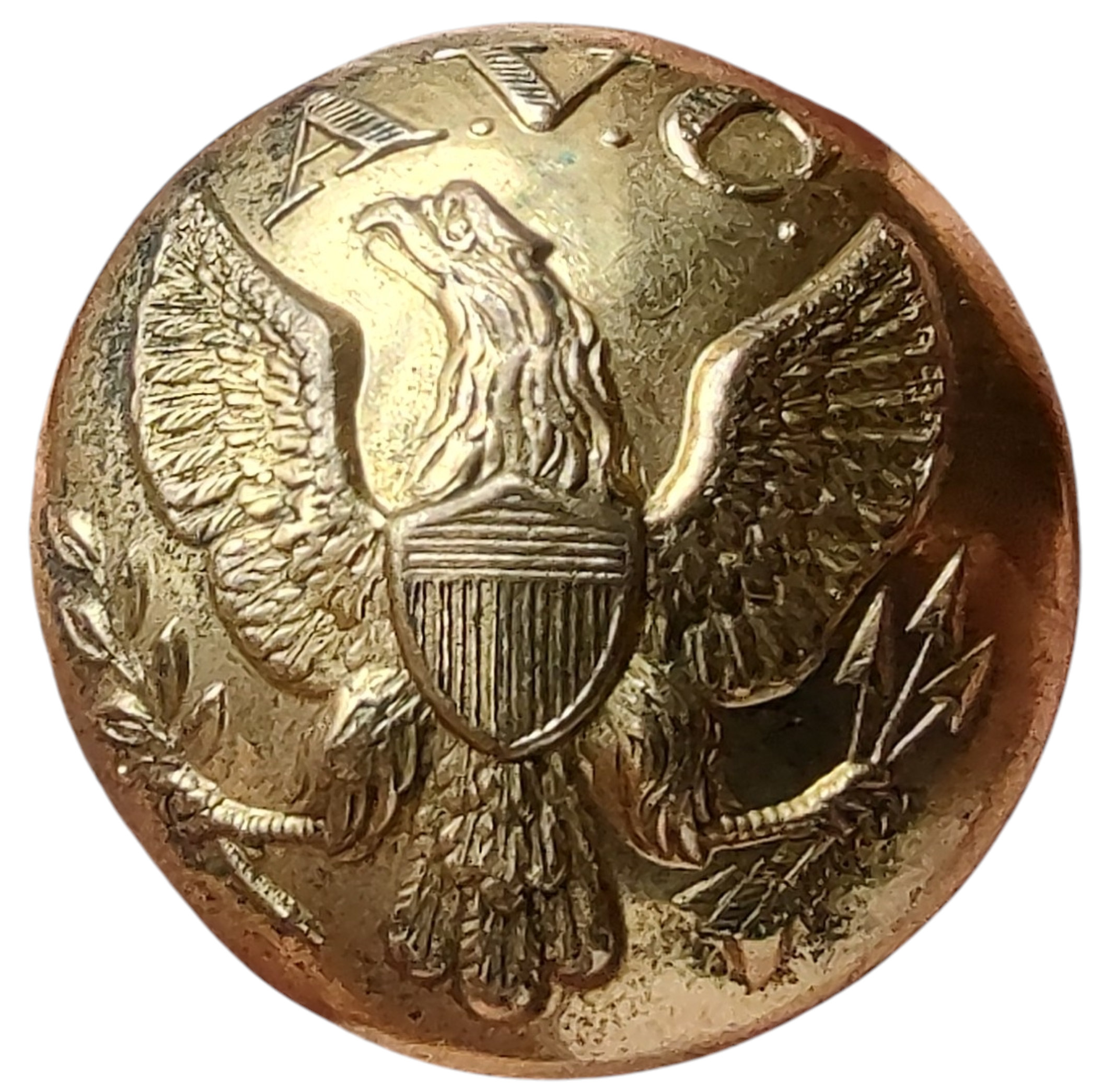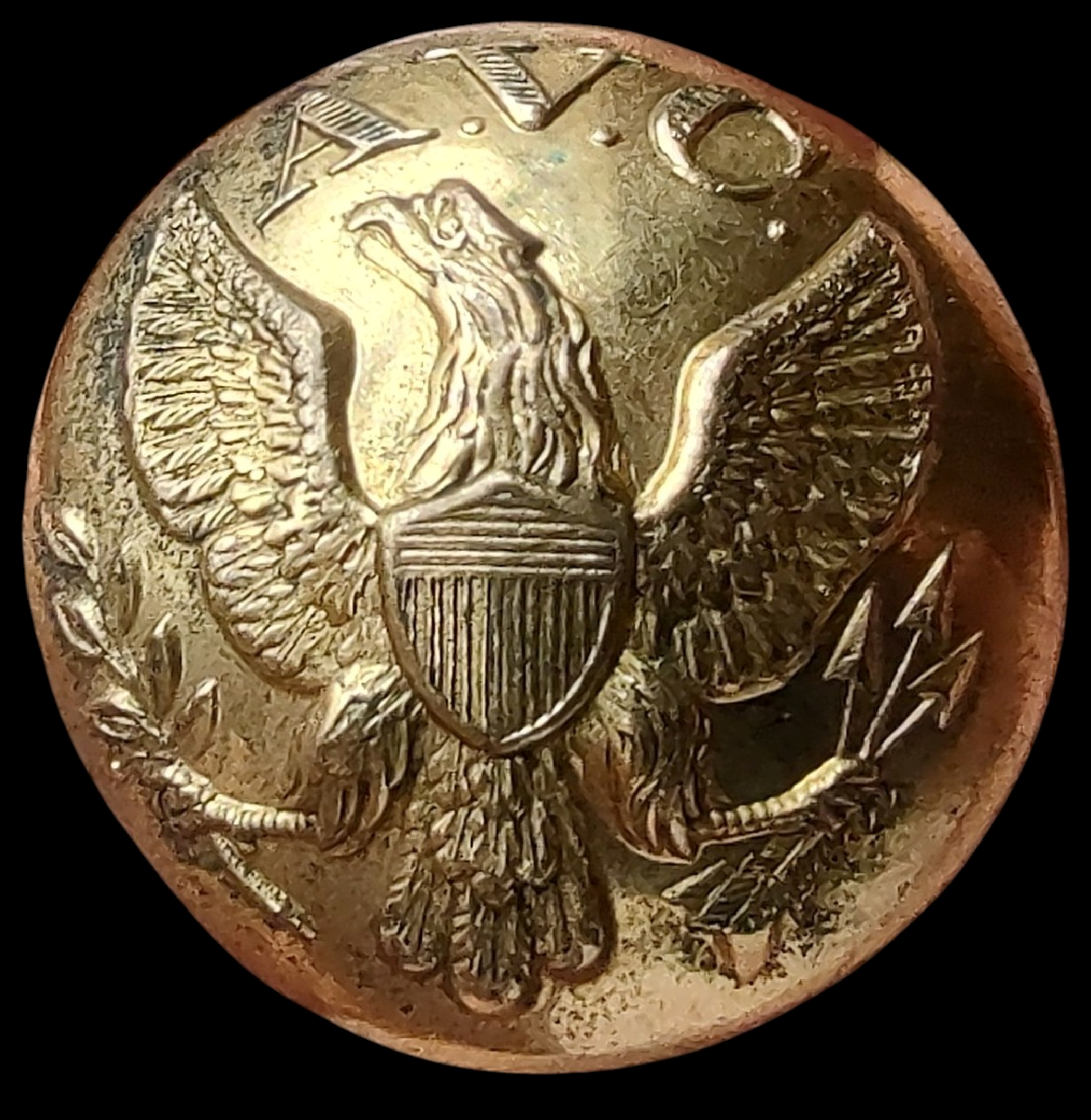 Featured Item: Non-excavated “Raised Wings AVC” 23mm. Tice reference AB210-A2 (Alberts AB2-A) Convex, Two-piece button. The lined initials “A.V.C.” are between the upswept wings of an Eagle on a plain field. The motif is unusual on a southern button, since Confederates favored the eagle in a “droop-wing position. 23mm.