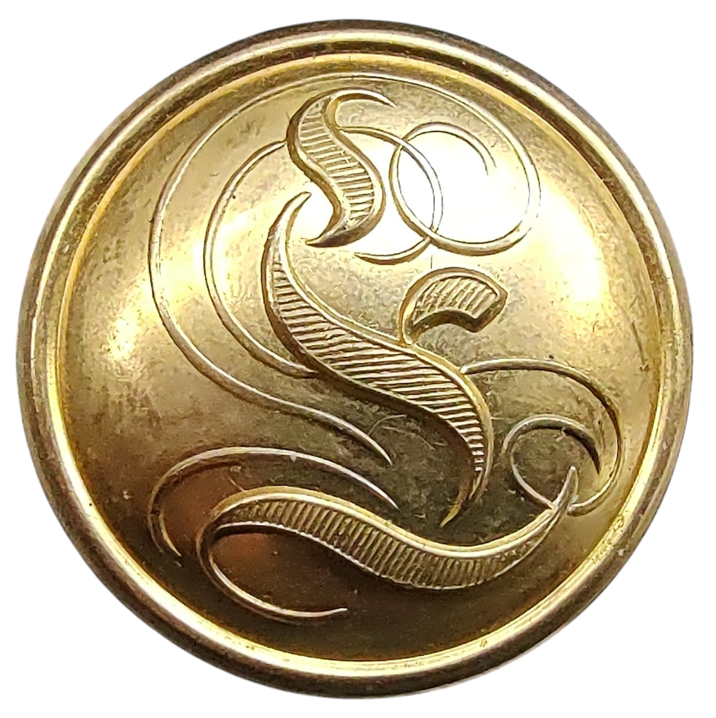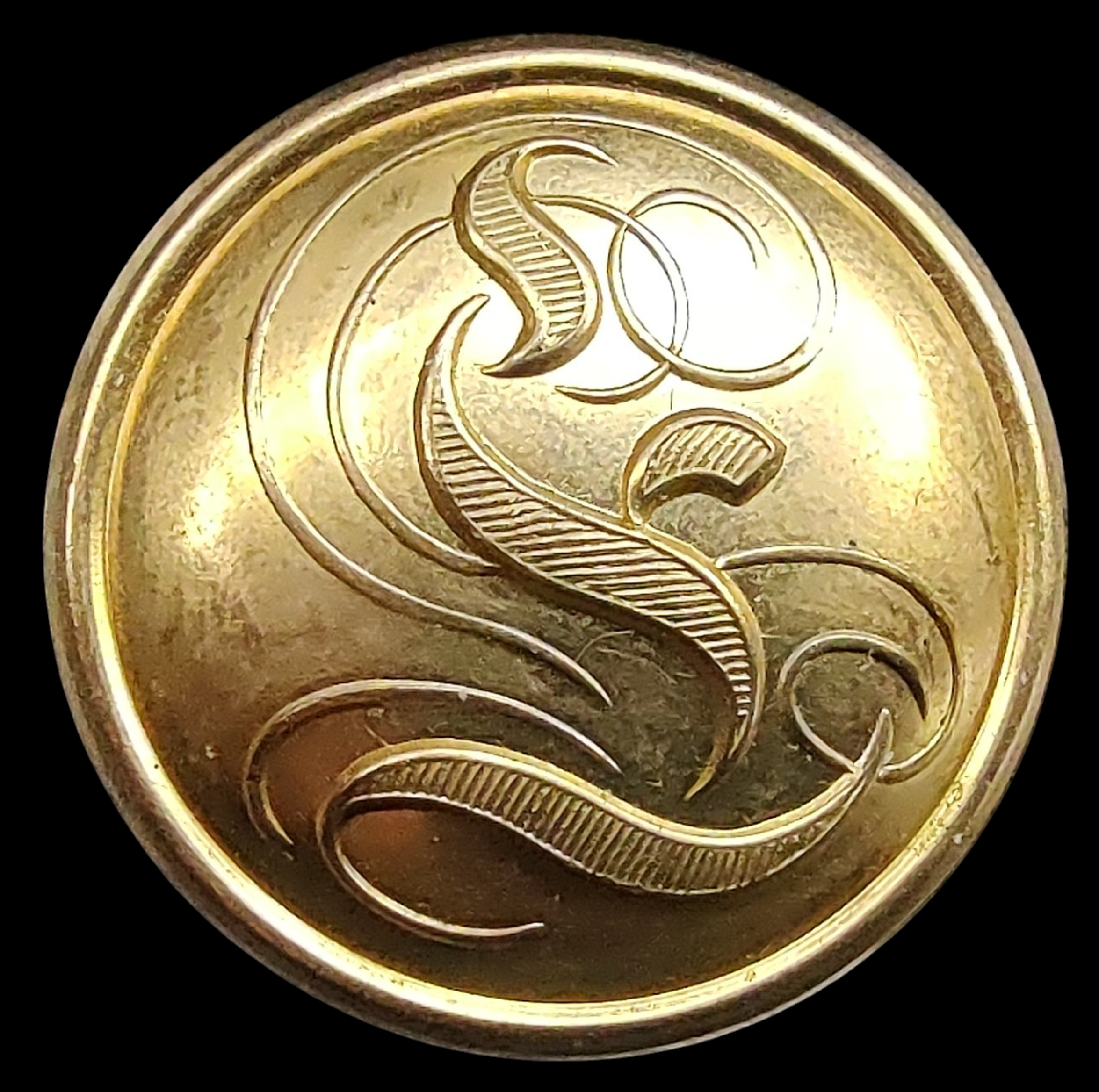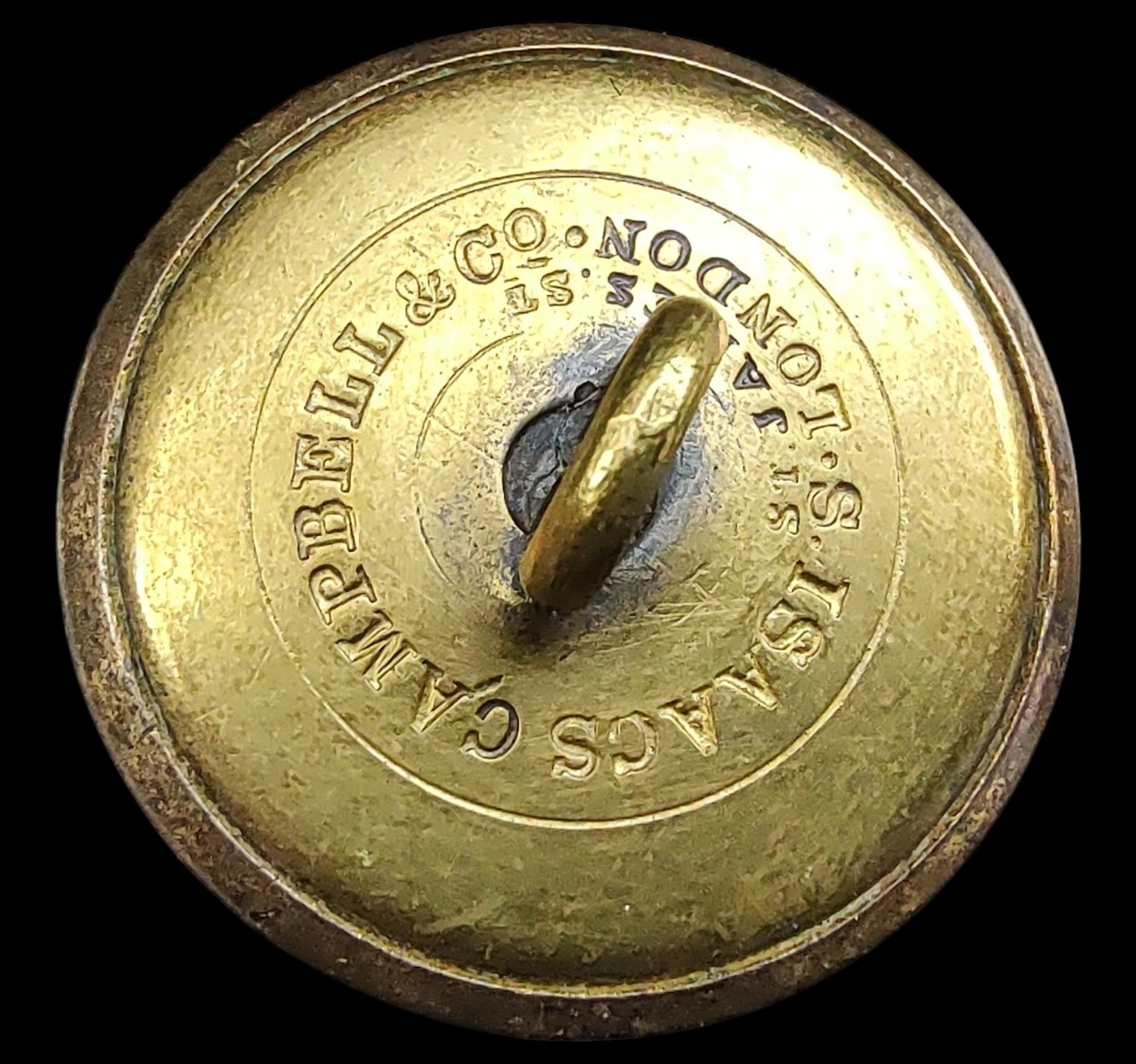 British manufactured for the Confederacy, Confederate Engineers.  Identification by Tice CSE 212-A1, Alberts CS 152. Convex, two-piece.  This button has always been popular with collectors and examples have commanded substantial prices, due to their size and unquestionable beauty. Cuff size version is rarer. Front has a lined Manuscript “E” on a plain field. 26mm. Backmark “S. ISAACS CAMPBELL, & CO. / LOMDON / ST. JAMES ST,”