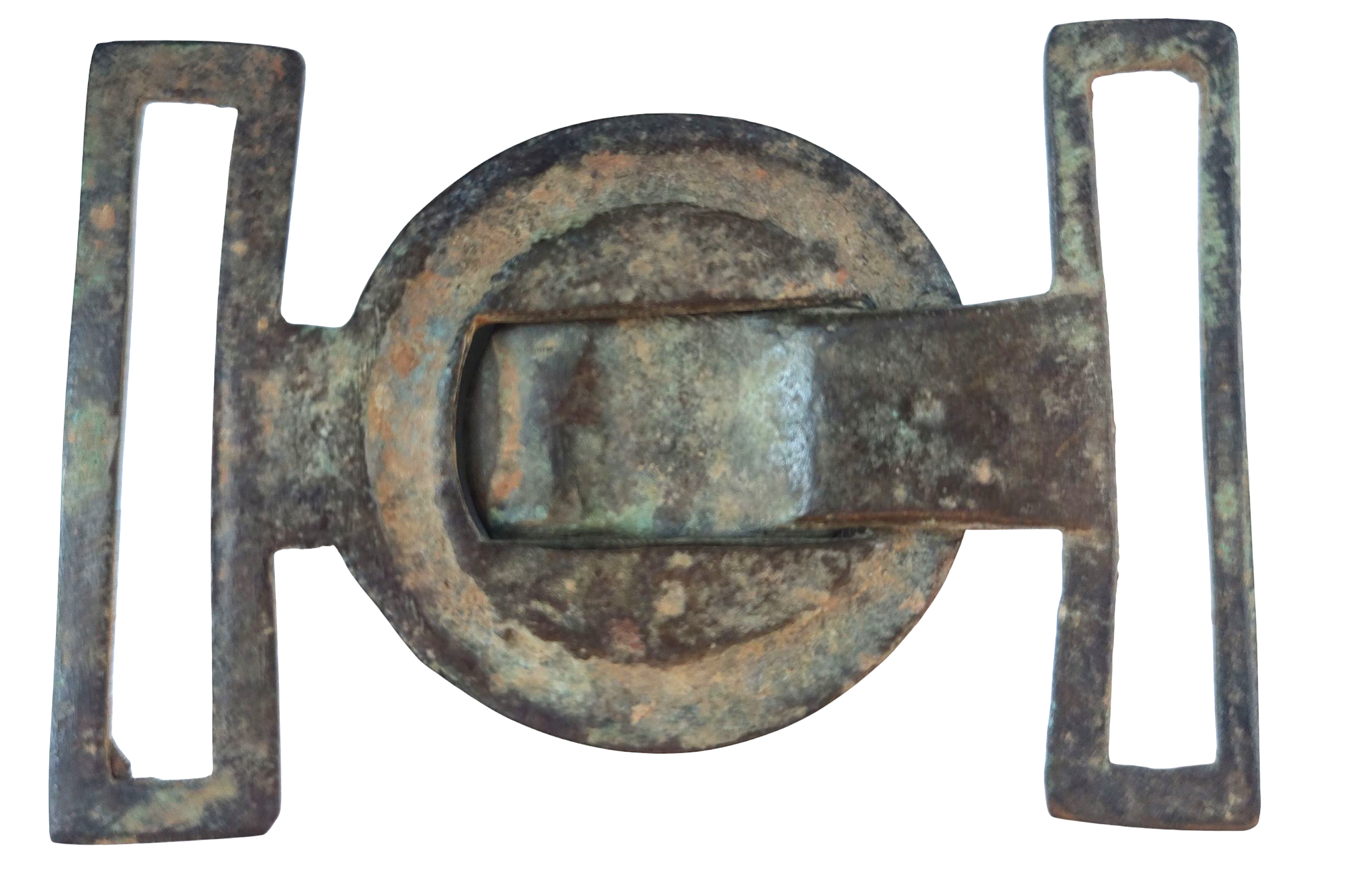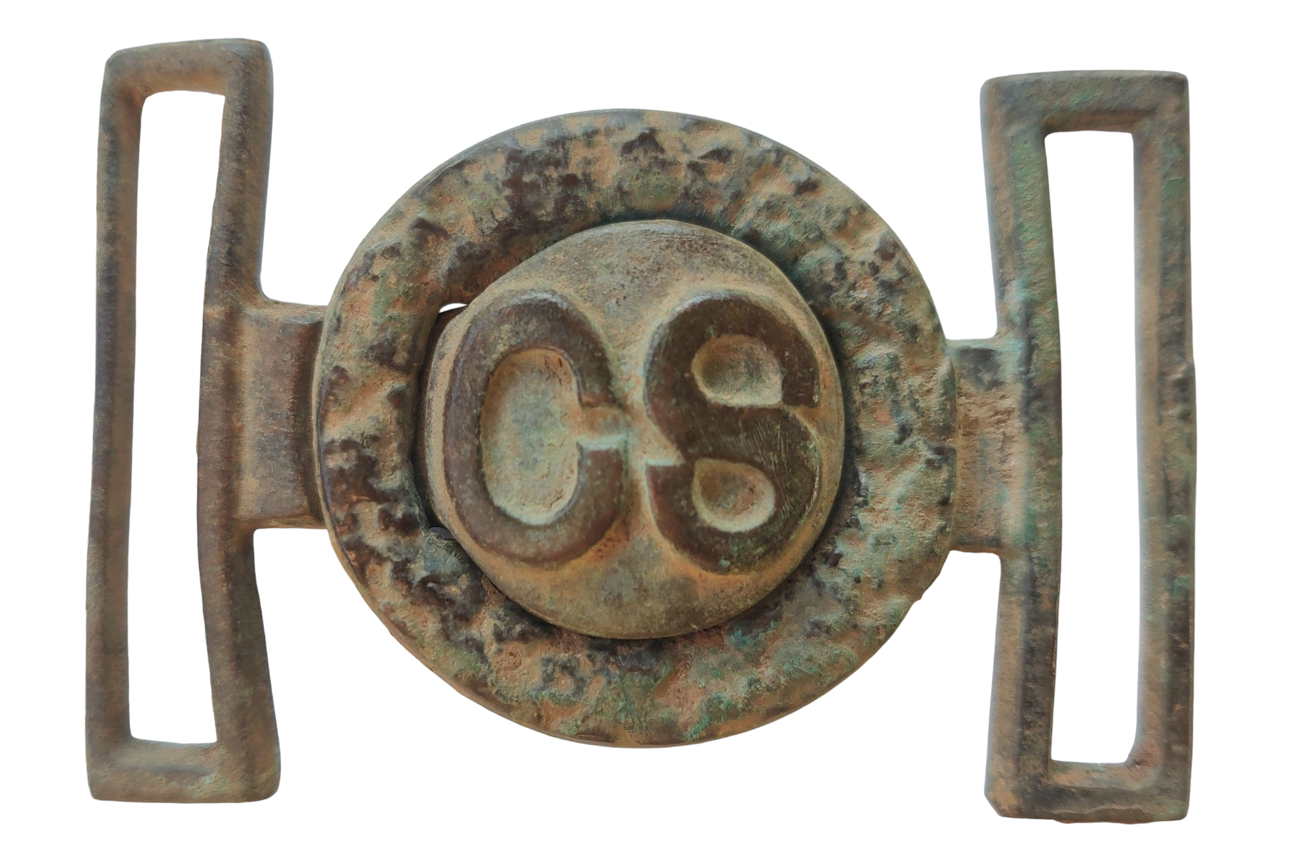 Featured is an outstanding excavated example CS buckle, manufactured by the firm of Leech and Rigdon, known as the “large belt loop pattern.” Primarily found in western theater sites, this example conforms exactly dimensionally to Plates 034 & 035, pages 27 & 28 “Confederate Buckles & Plates” by Steve E. Mullinax.” Dimensions: 54 X 76 mm / wreath ht. 44mm. Large belt loop style with small thick coin-type tongue disc. Note the casting air vent mark on back of tongue bar and wreath- a common feature.