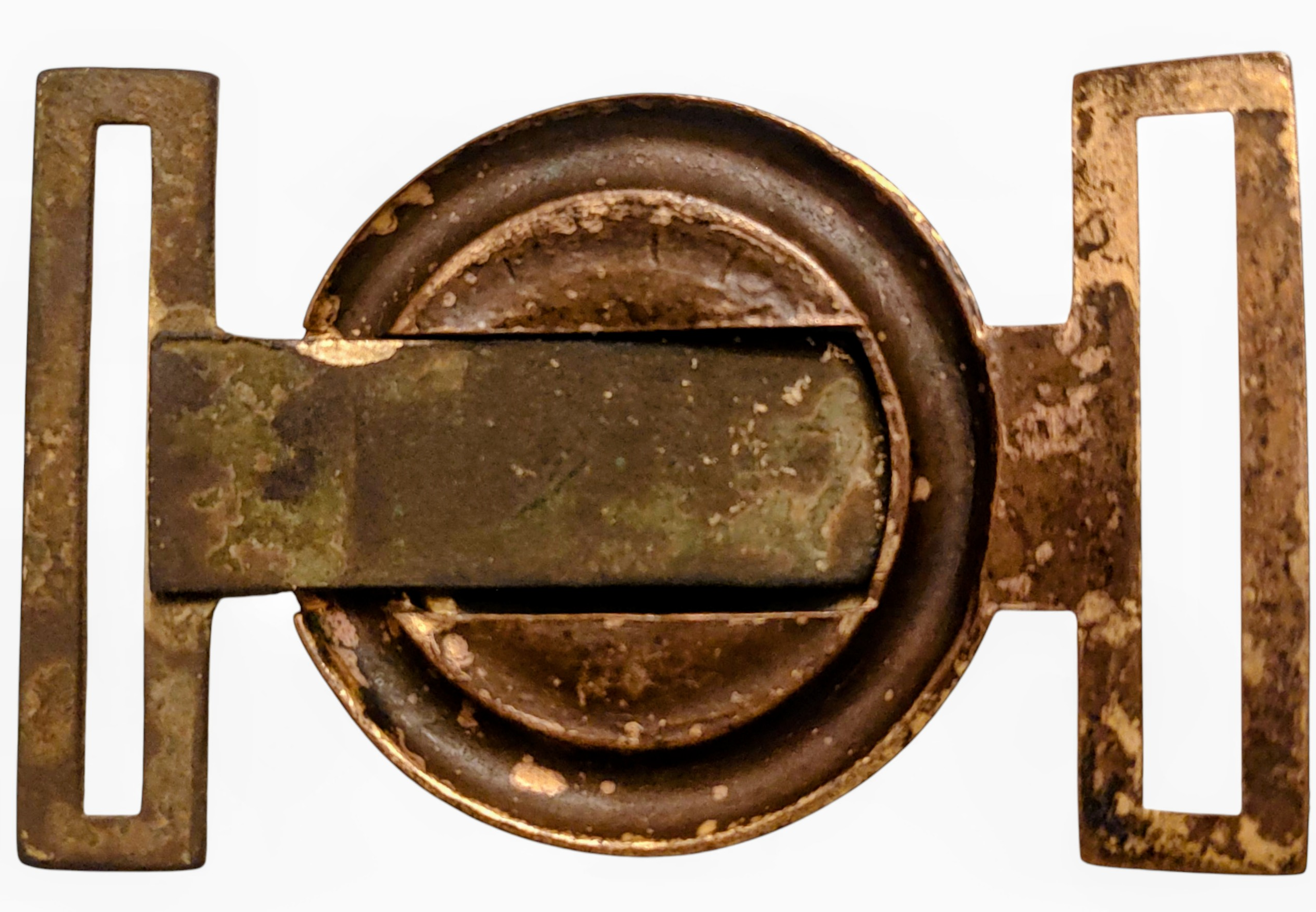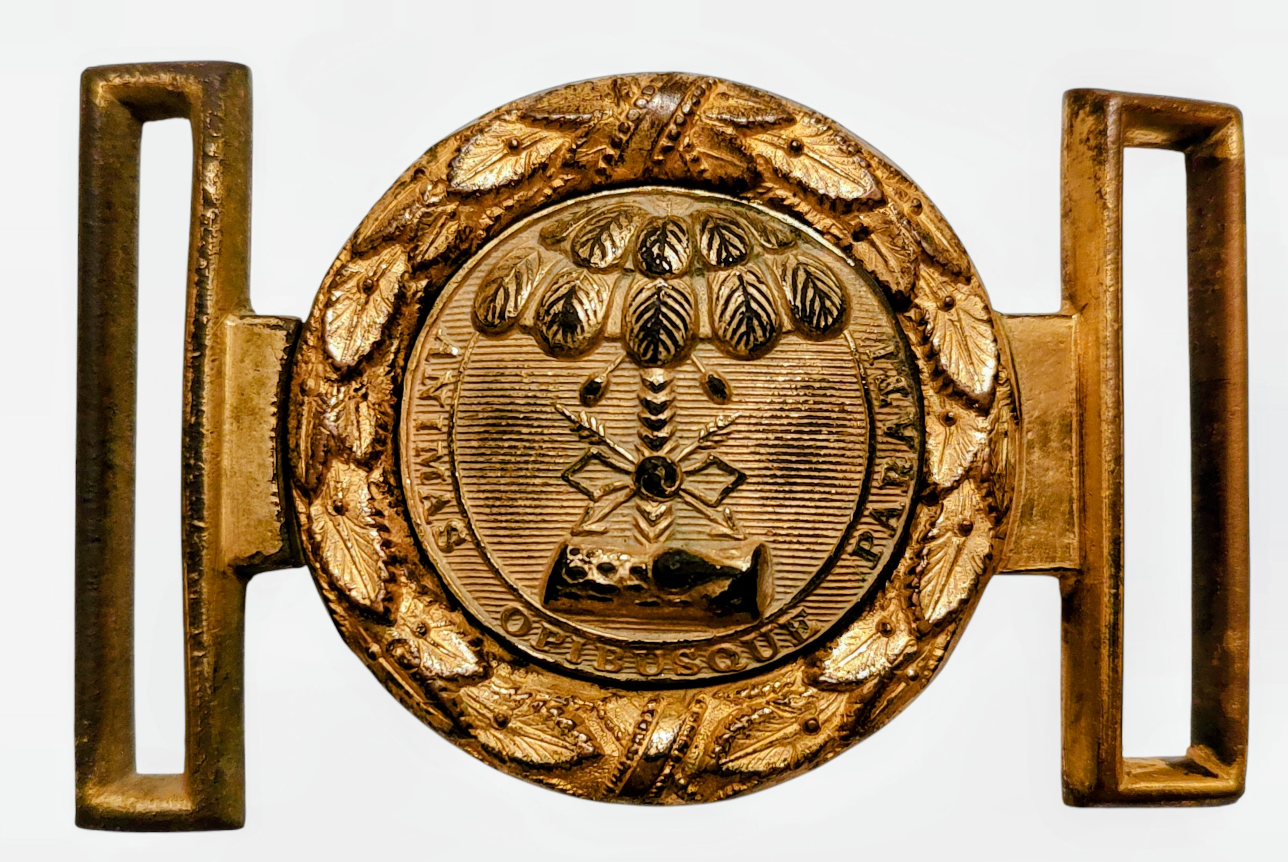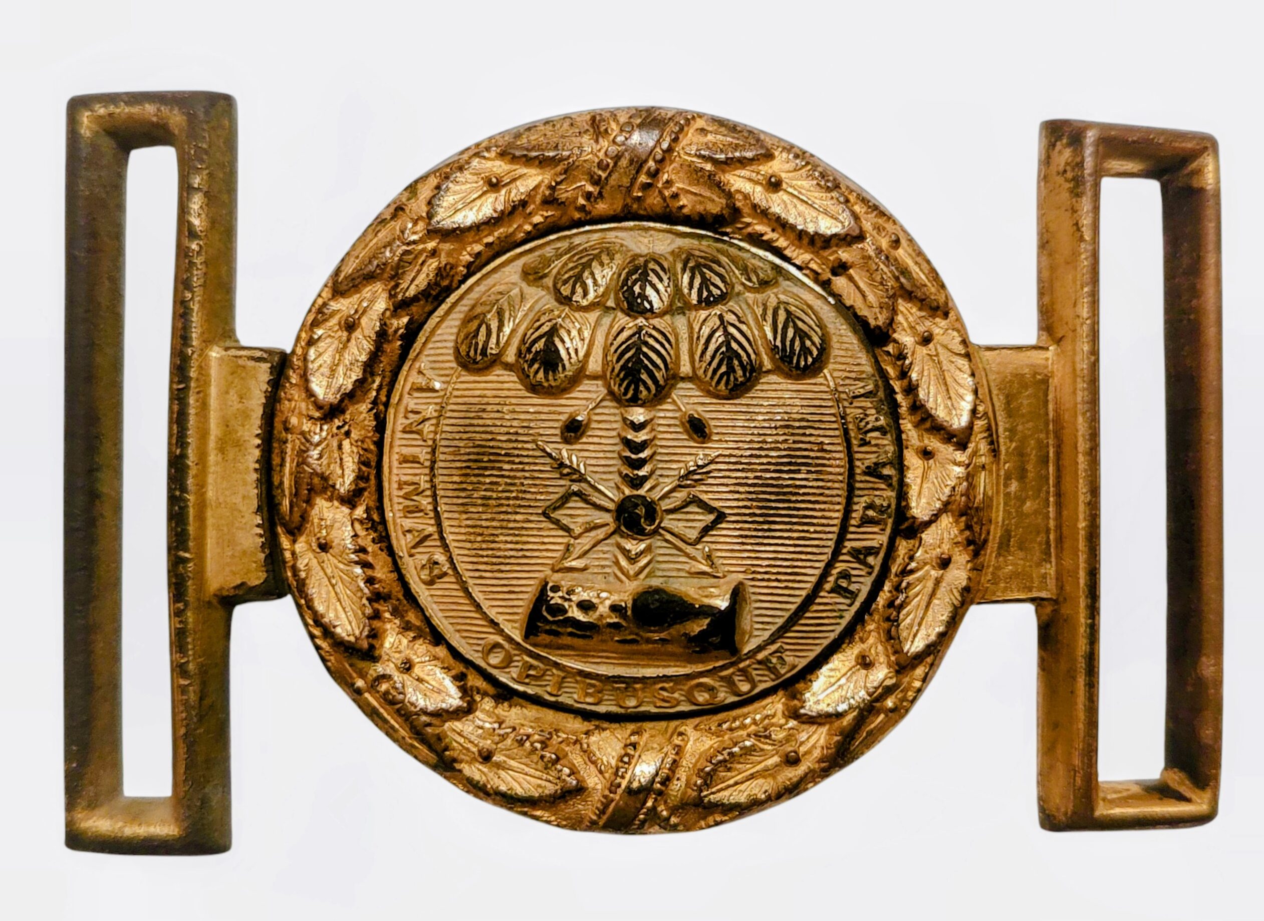 Offered for sale is a beautiful “non-excavated” two-piece South Carolina Officers buckle measuring Dimensions: 56 X 85mm / wreath ht. 52mm, with production date range of 1855-1865, with  both tongue & wreath stamped numbered #22. Construction: gold-plated tongue disc and belt loops, die struck construction from five pieces of rolled brass with high copper content. This pattern plate is typically encountered on its original belt. Very similar to Plates 351 & 353, reference pages 192 & 193, “Confederate Buckles and Plates by Steve Mullinax; Expanded Edition.” Referenced that individual Officers usually acquired these belt sets, when purchasing a sword, and in many cases entire companies ordered such finely crafted belt sets. The Great Seal of South Carolina was “set” or “affixed” to the Ordinance of Secession of December 20, 1860, at Secession Hall in Charleston shortly after 7:00 p.m., following which convention delegates signed it, including Robert Barnwell Rhett, as some three thousand South Carolinians watched enthusiastically the proclamation of South Carolina as “a separate, independent nationality.”
